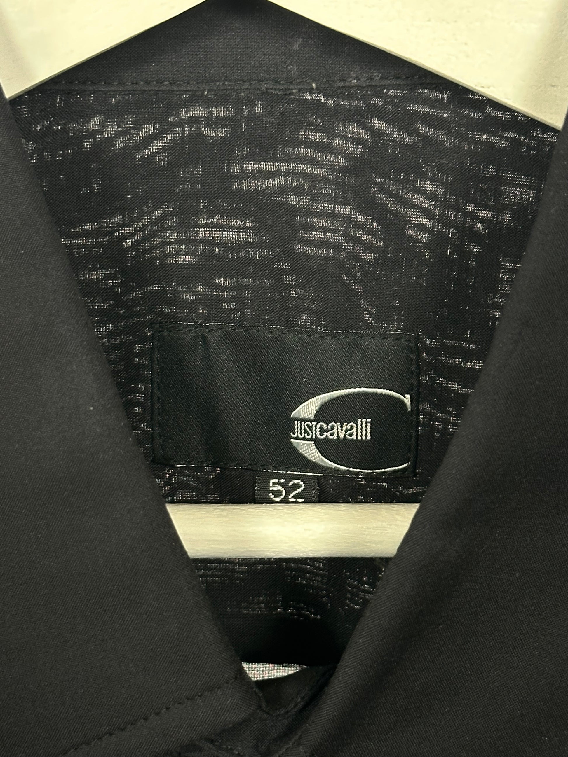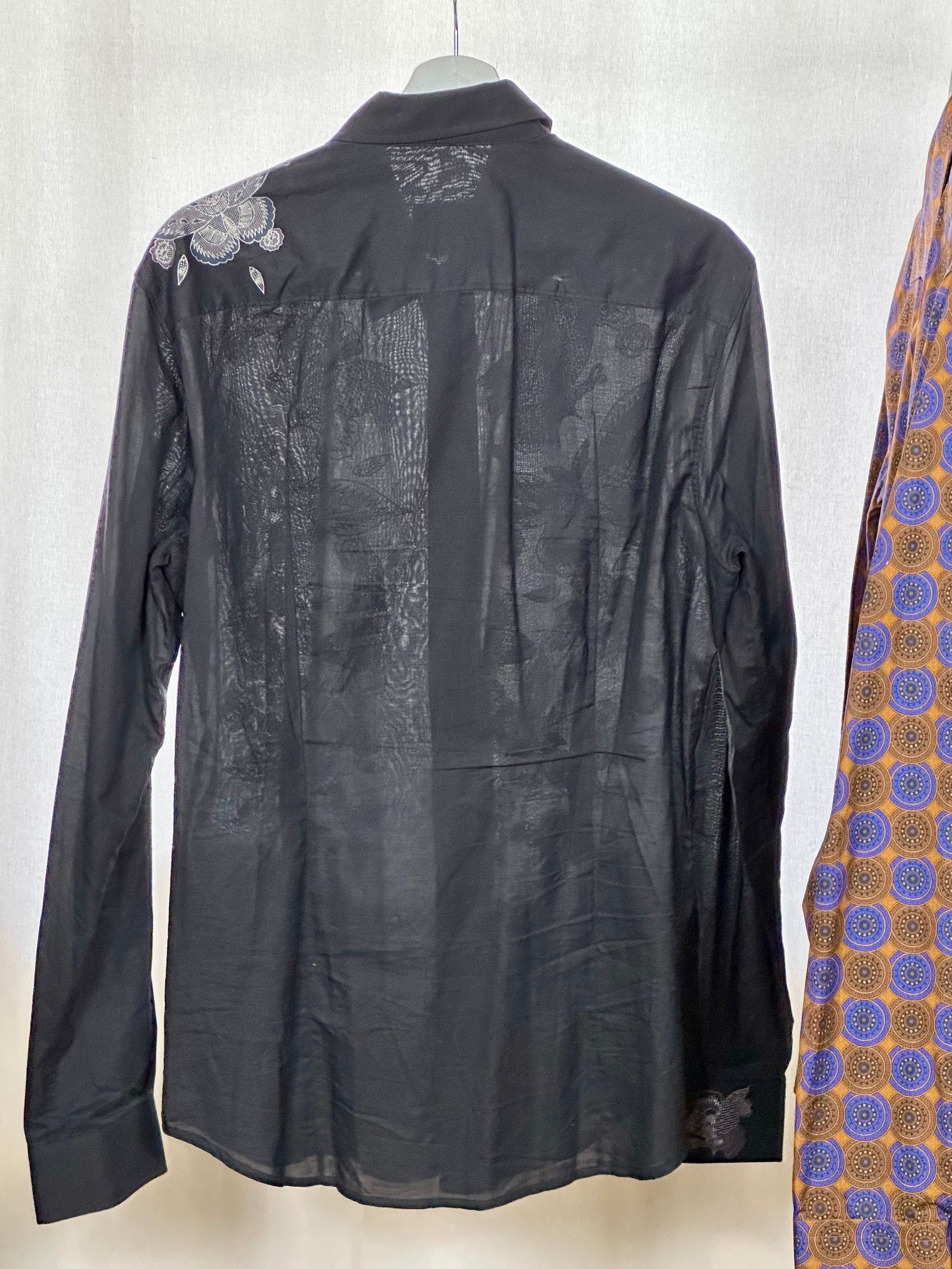 This early-2000s Just Cavalli shirt features a semi-sheer black cotton base covered in intricate butterfly and floral motifs — equal parts romantic and bold. The fabric has a subtle sheen that catches the light, while the long cuffs and tailored cut keep it sharply elegant. It’s Cavalli doing what Cavalli did best: unapologetic glamour with a twist of rock energy.