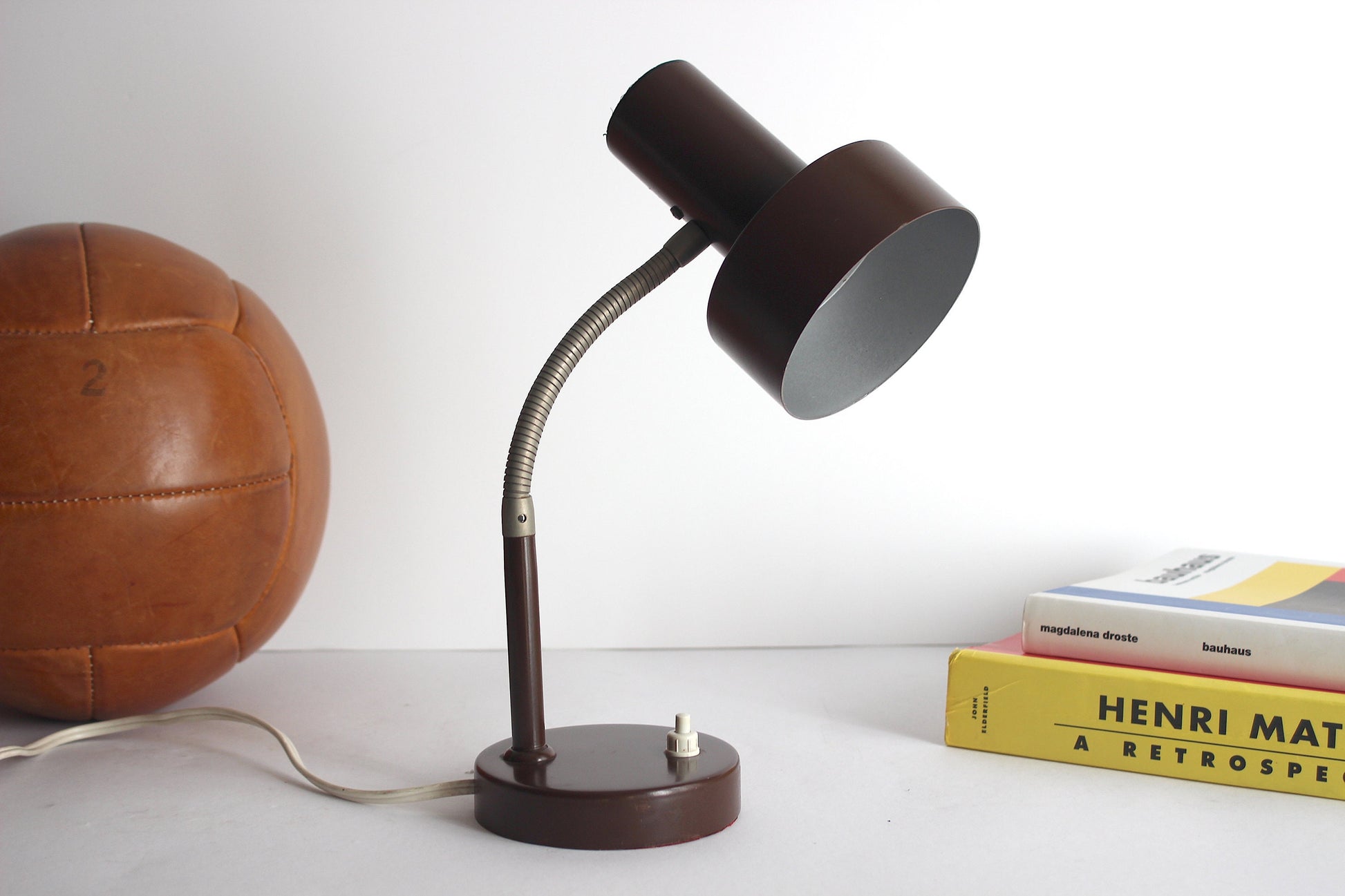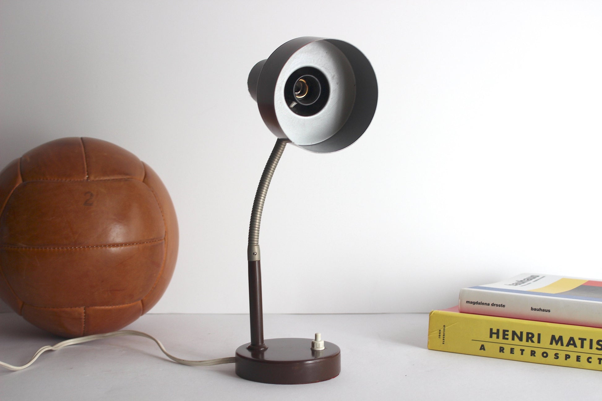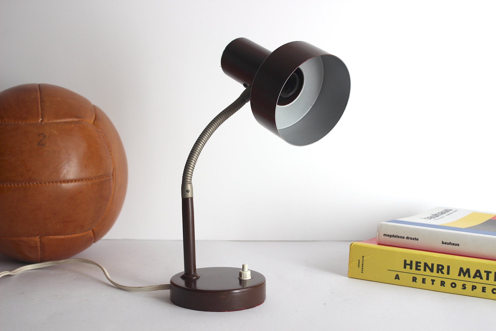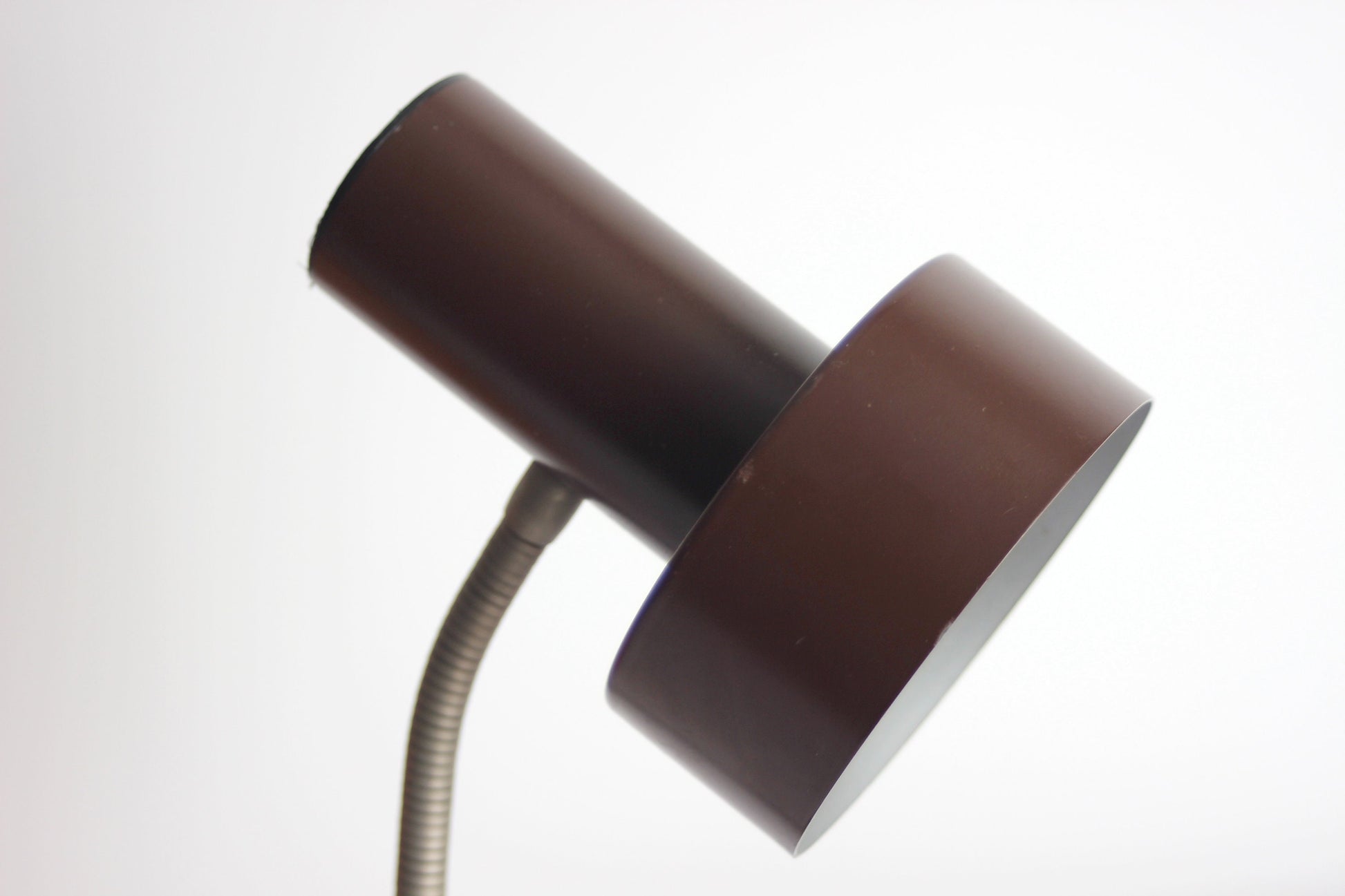 Small vintage gooseneck desk lamp. Brown with silver and white details. 70s.
