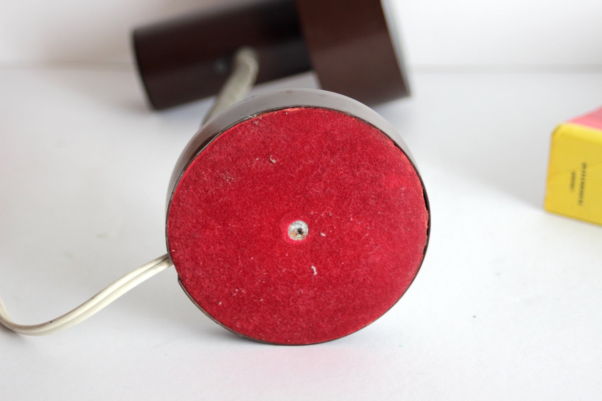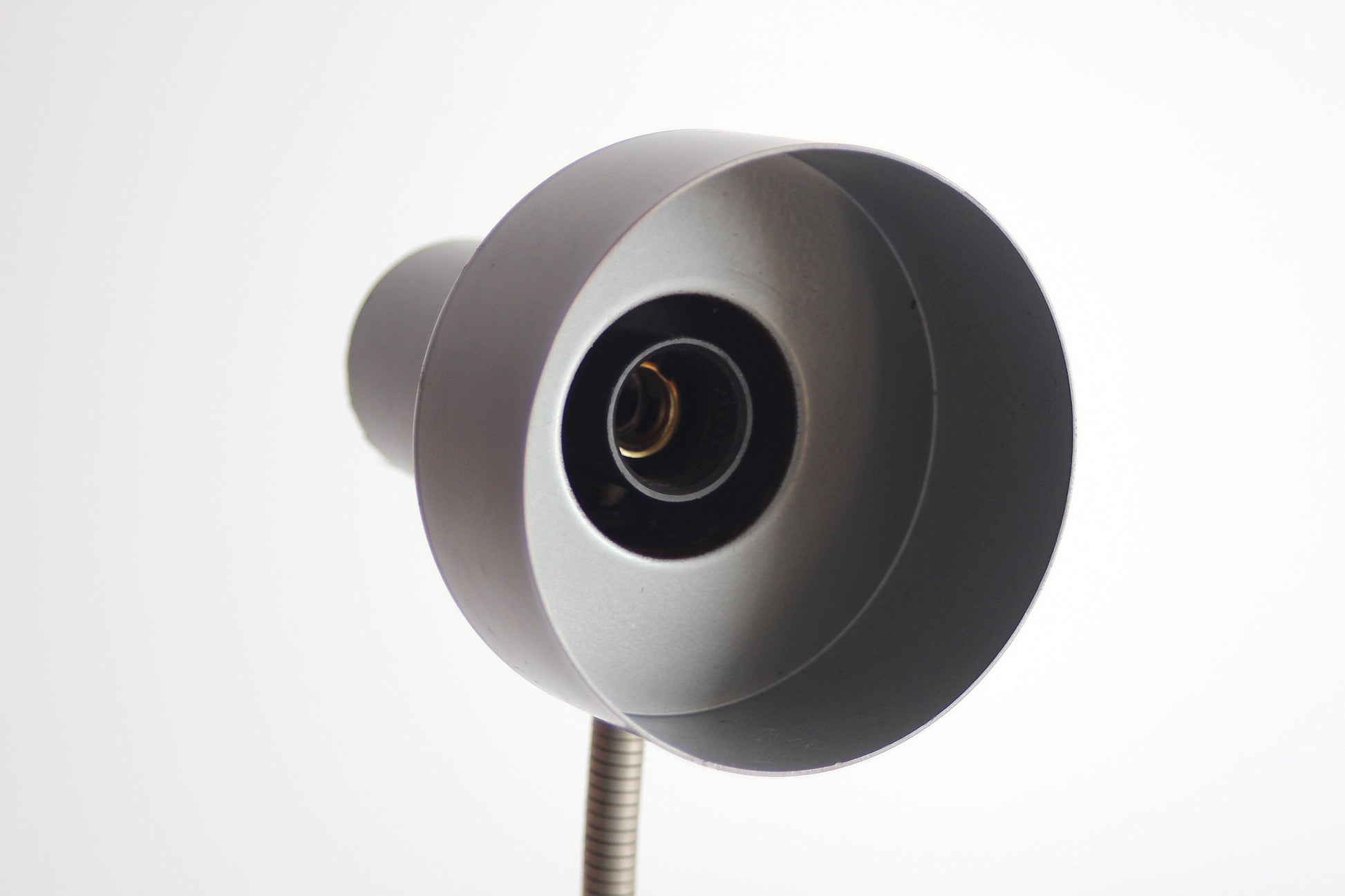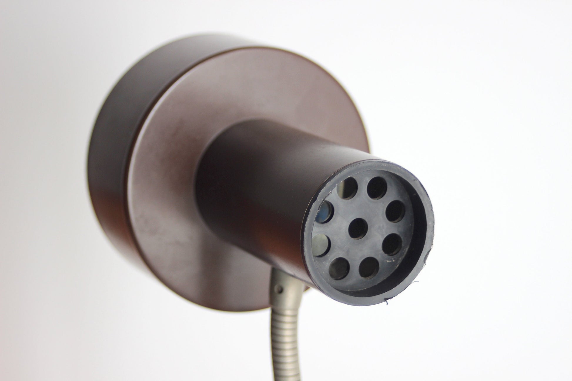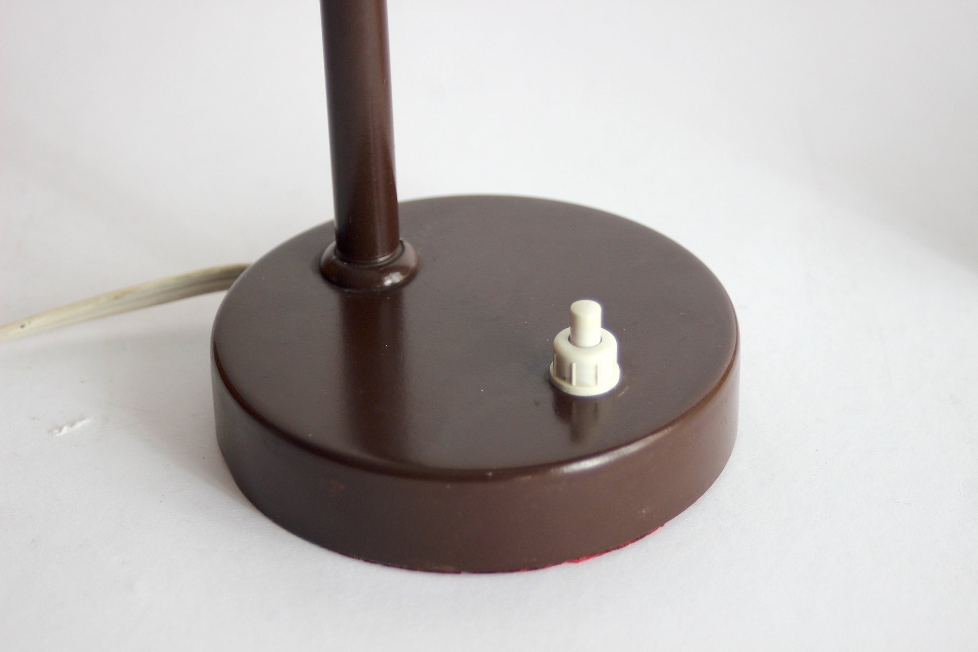 Small vintage gooseneck desk lamp. Brown with silver and white details. 70s.