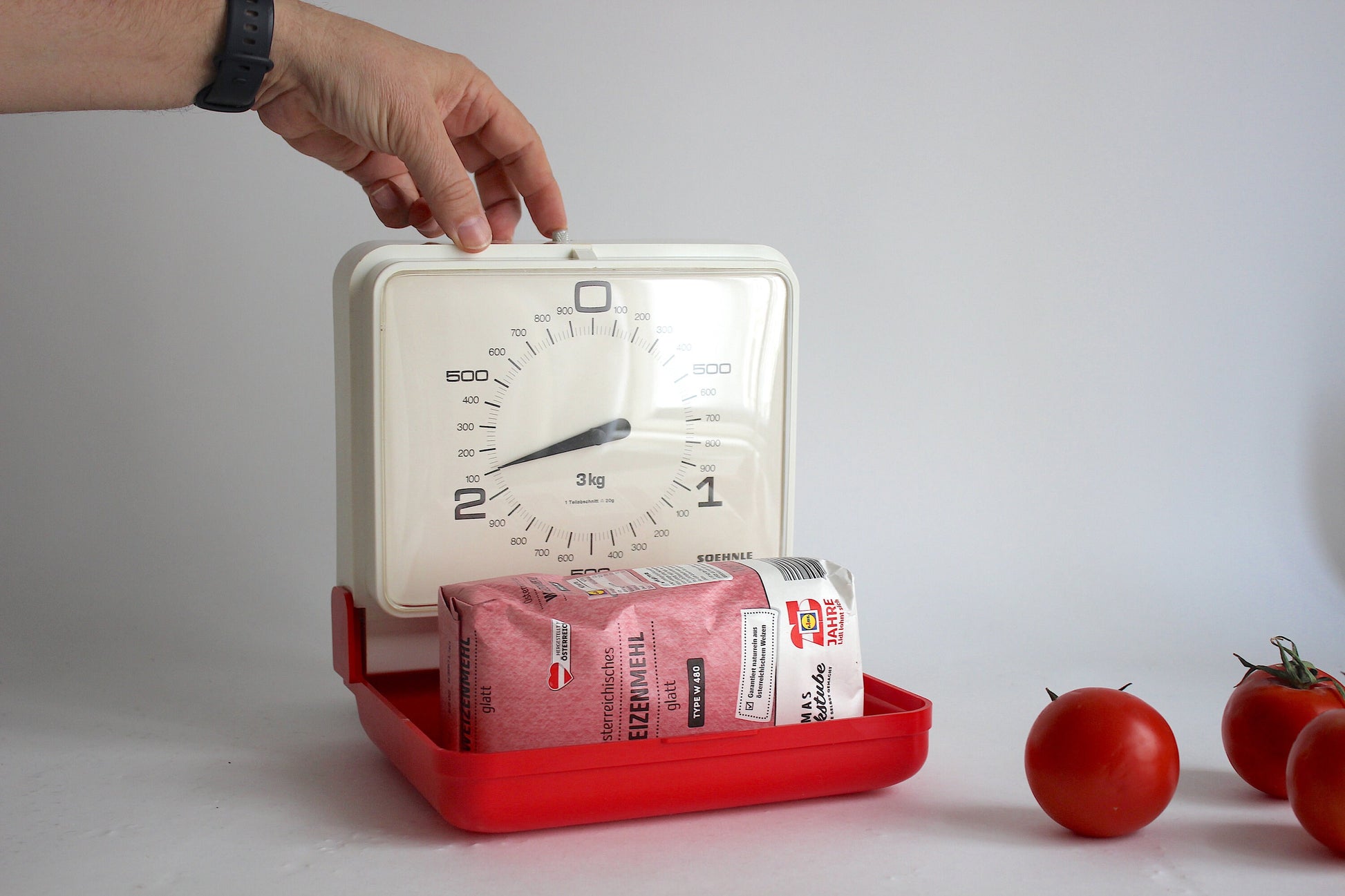 SOEHNLE wall scale. Made in Germany in the 70s. It is two-tone, white and red, and must be fixed to the wall to work properly. The lid that closes the weight is also the measuring container. This lid can be easily removed from the balance for cleaning. It can weigh from 10 gr. up to 3kg.