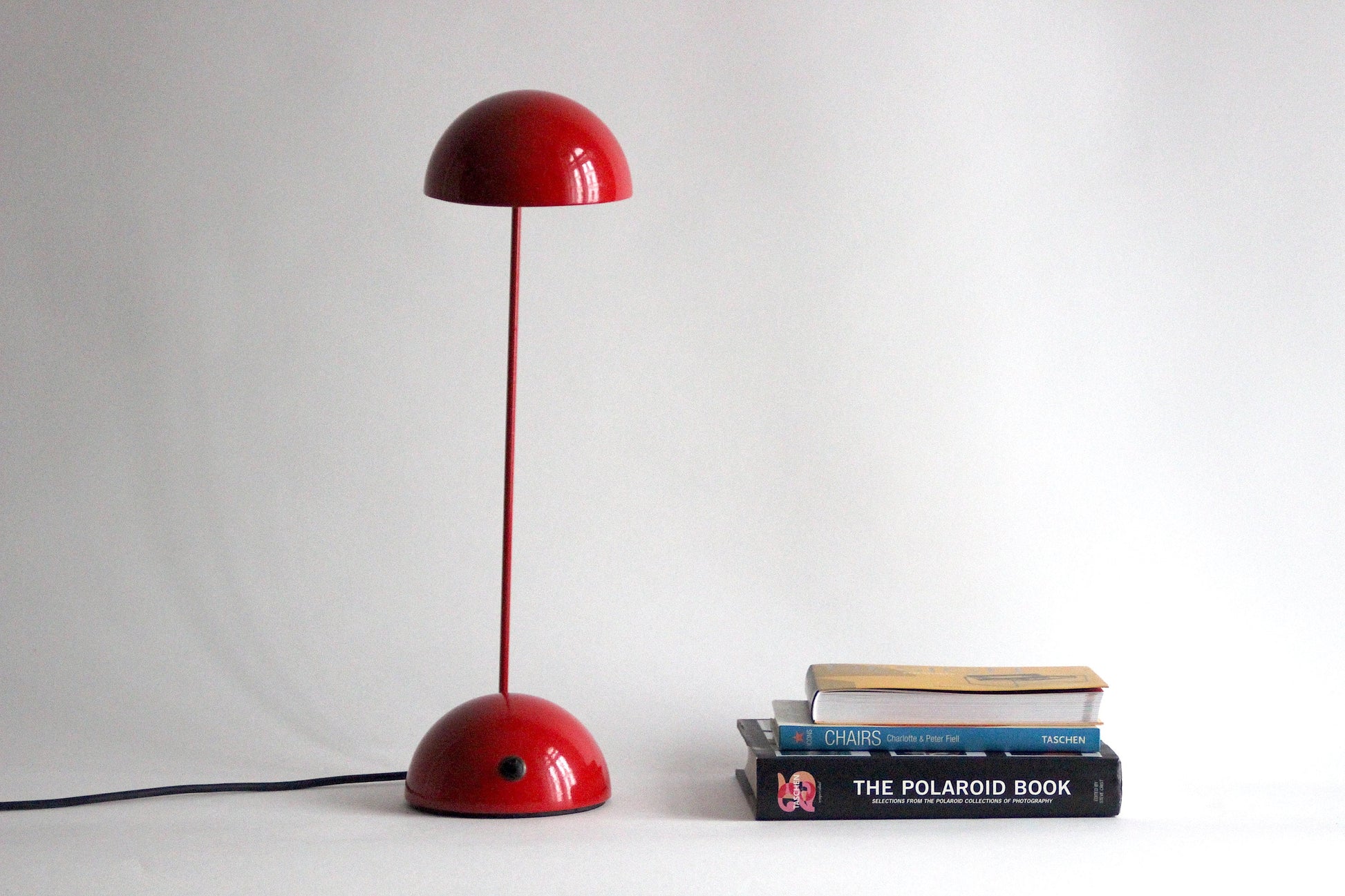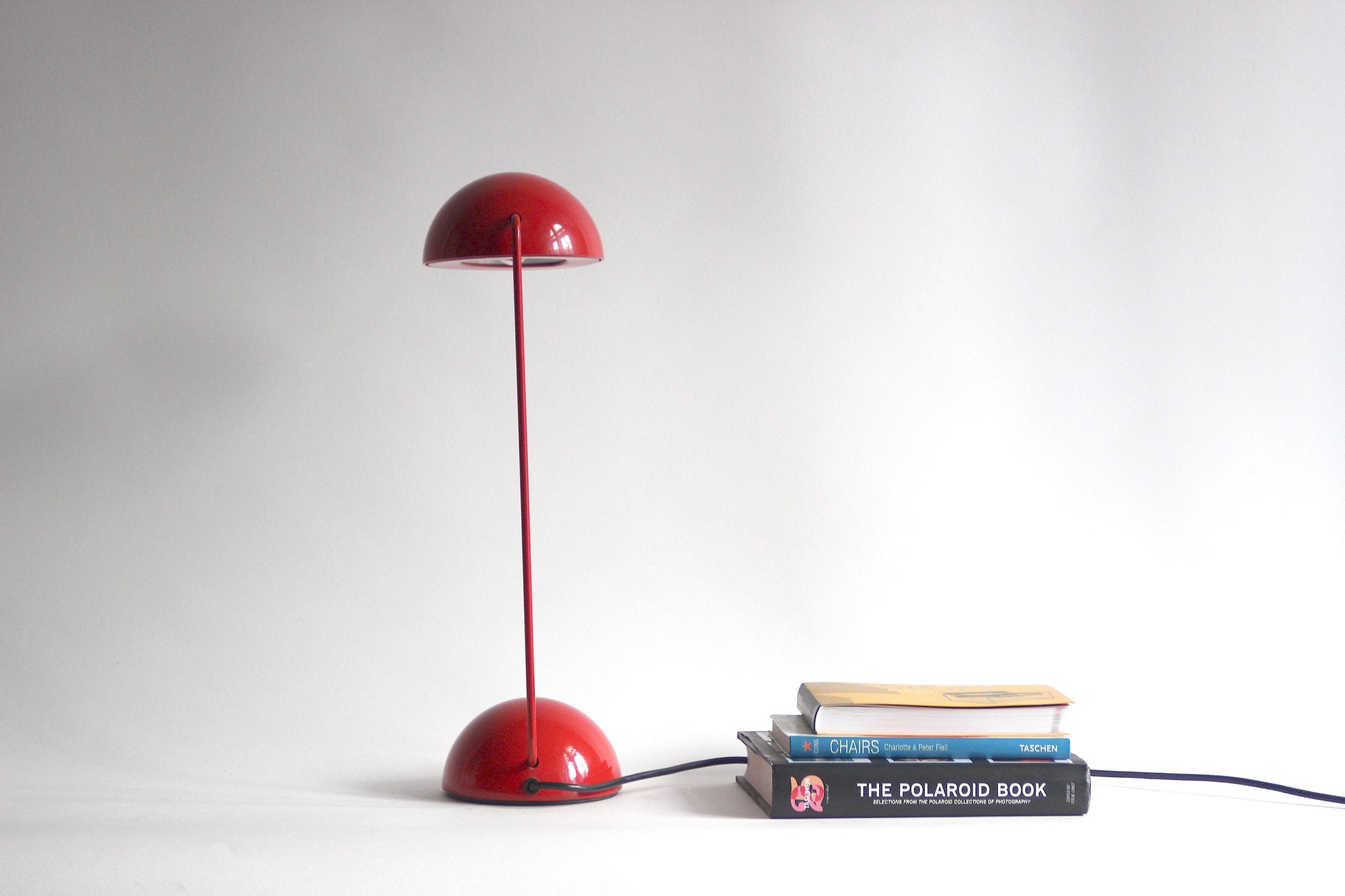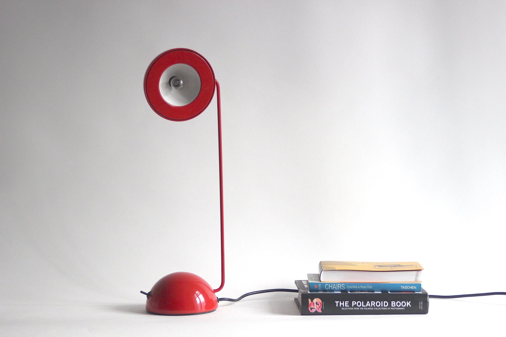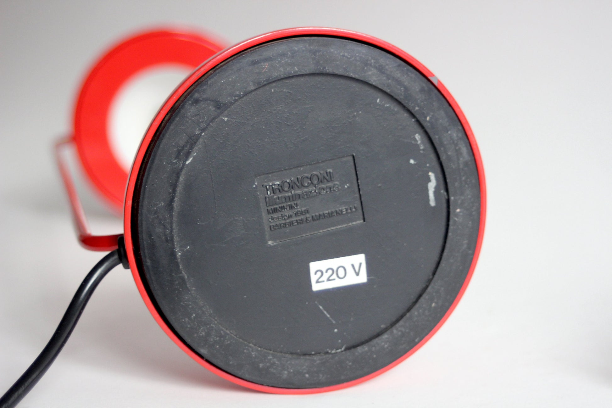 Red adjustable table lamp "Bikini Minikin". On the bottom is Tronconi's dedicated label and details of the designers.